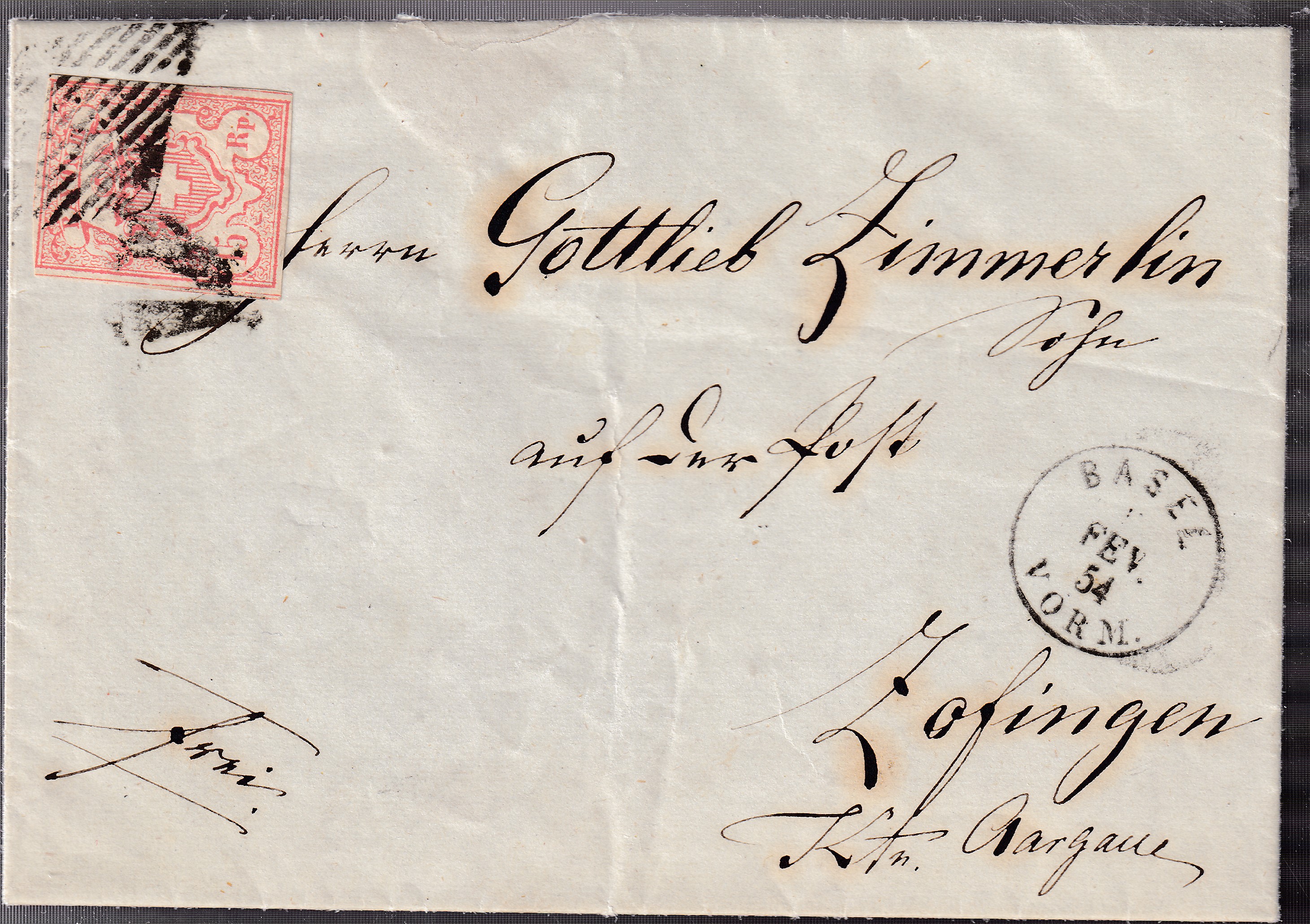Sauberer Brief von Basel nach Zofingen adressiert, frankiert mit 15 Rp. RAYON III, grosse Ziffer, rot, Type 5. Die Marke ist farbfrisch, mit schwarzer Raute und schwarzer "V" (vom Postkreis V ?) und BASEL 17 FEV 54. Sie ist gut gerandet und fehlerfrei erhalten. |